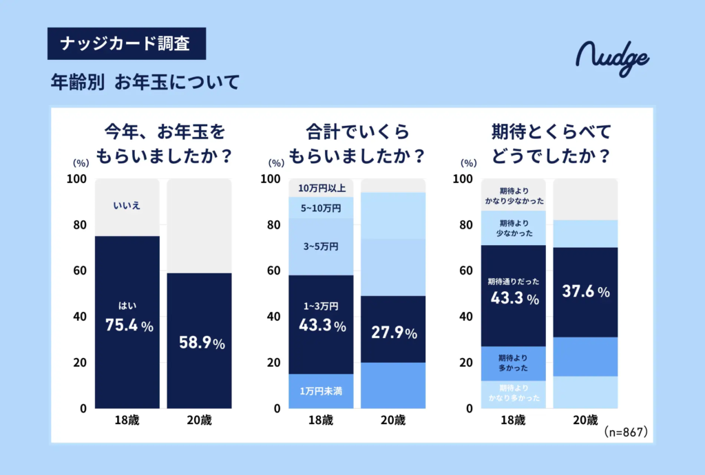 ナッジ株式会社が発表した「お年玉に関する実態調査」によると、2026年のお正月に新成人(18歳・20歳)がお年玉の使い道として、貯蓄に次いで「推し活・エンタメ」を挙げたことが分かりました。また、お年玉の受け取り方においても、長らく「現金一強」であった状況に変化が見られ、キャッシュレス化の波が押し寄せていることが明らかになりました。